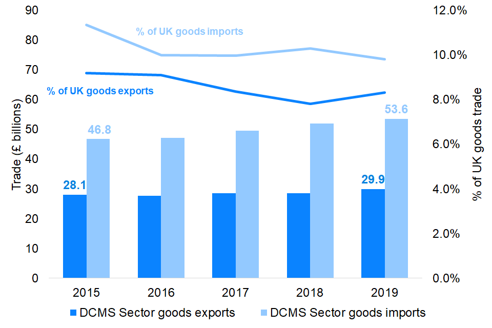- Imports of goods for DCMS sectors have been consistently higher than exports of goods (2015 to 2019).