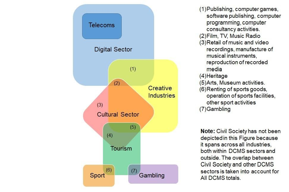 Each sector definition has been designed to be the best possible measure of that sector, rather than being considered as part of a greater whole. This approach has led to overlap between DCMS sectors, whereby an industry (as defined by 4-digit Standard Industrial Classification, or SIC, codes) may simultaneously be a Cultural Sector SIC code and a Creative Industries SIC code. In particular, the Cultural Sector is defined using SIC codes that are nearly all within the Creative Industries, whilst the Telecoms Sector is completely within the Digital Sector.