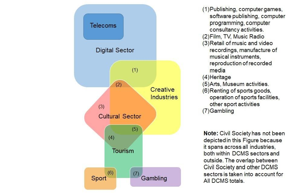 Each sector definition has been designed to be the best possible measure of that sector, rather than being considered as part of a greater whole. This approach has led to overlap between DCMS sectors. For example, the Cultural Sector is defined using SIC codes that are nearly all within the Creative Industries, whilst the Telecoms Sector is completely within the Digital Sector.