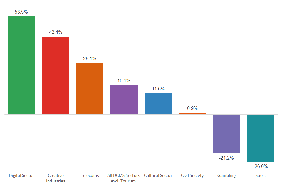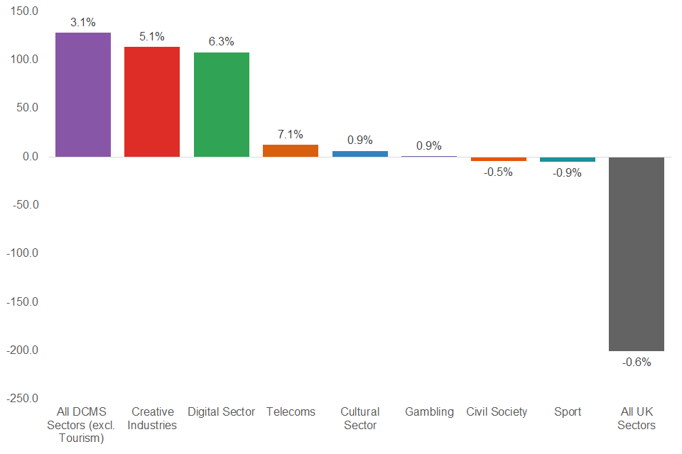 Figure 1 - Employment growth in the DCMS Sectors (excluding Tourism) was predominantly driven by increases in the Creative Industries and Digital Sector, the two largest DCMS Sectors (excluding Tourism) by number of jobs. However, it was partially offset by small decreases in the Sport and Civil Society sectors (note that the sum of the sector differences do not equal the overall DCMS change because of overlap between the sectors).