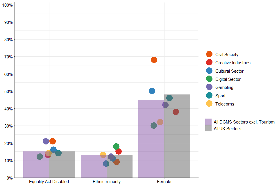 - As of 2021, within the DCMS Sectors (excluding Tourism), 44.5% of filled jobs were held by women, 15.0% by people with a disability (as defined under the Equality Act 2010), and 13.2% by people from ethnic minority groups (excluding white minorities); this marks a lower representation of women than the UK overall but a similar proportion of minority ethnic and disabled people.