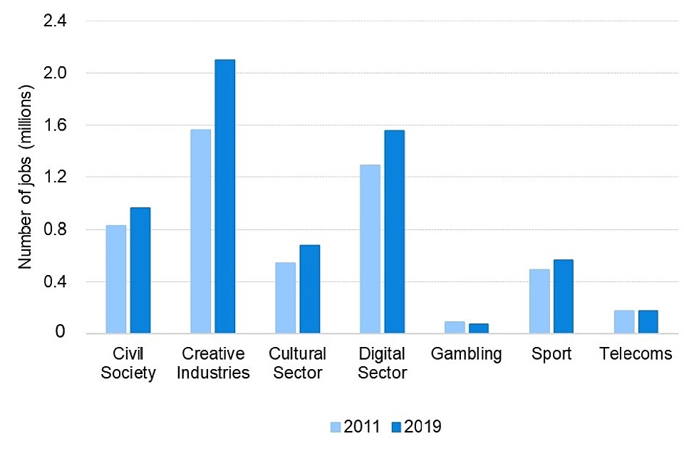 In addition to the Creative Industries, four other DCMS sectors experienced faster job growth than the UK-wide average (11.4%): the Cultural sector (24.0%), the Digital sector (20.6%), Civil Society (16.6%) and the Sport sector (14.5%).