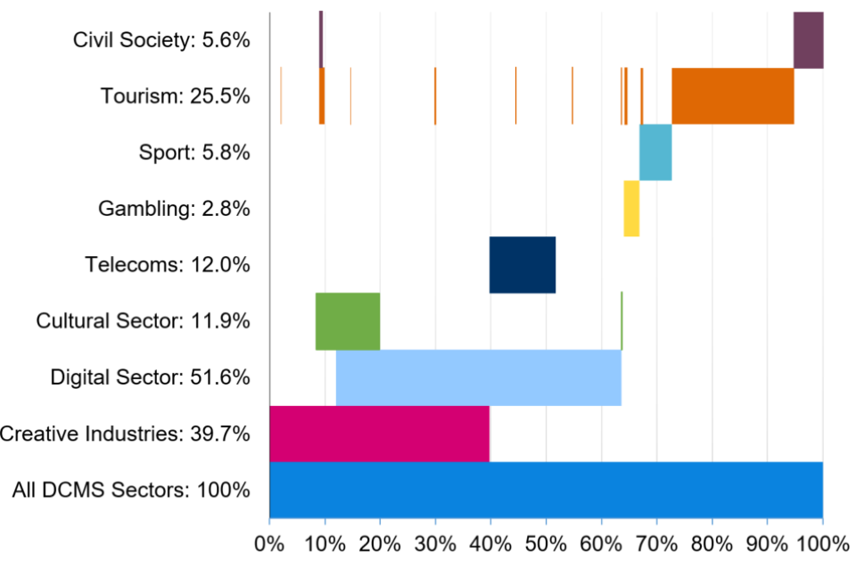 A bar chart showing the proportion of national DCMS GVA for each sector, and the proportion of these sectors that overlap with one another.