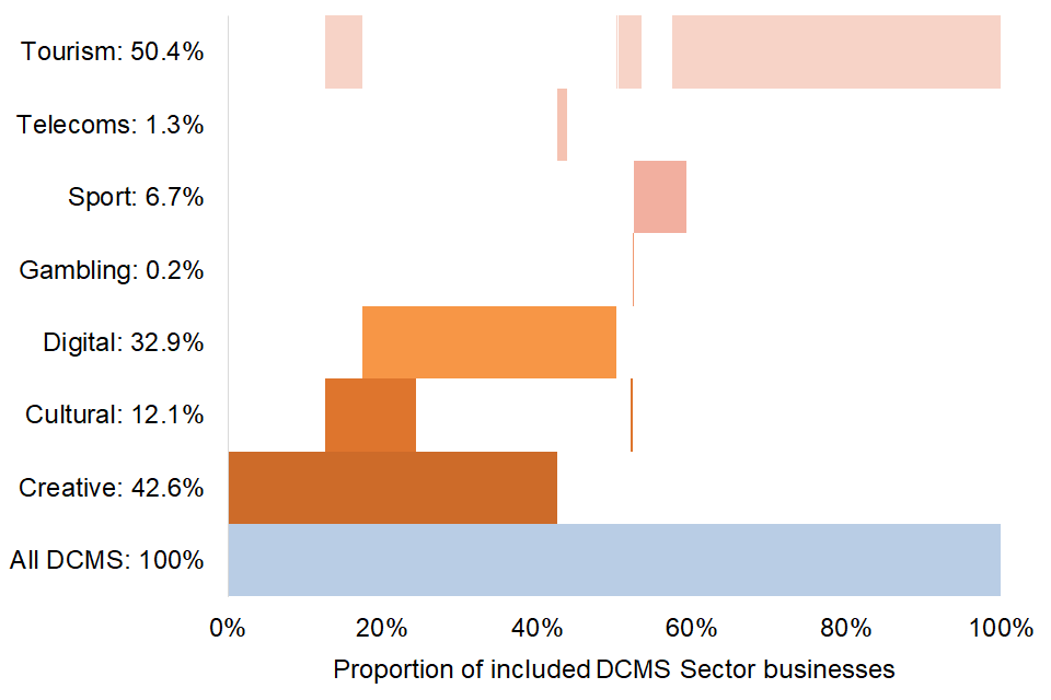 The development of individual sector definitions in isolation as new sectors have been added to the department’s remit has meant that each sector definition has been designed to be the best possible measure of that sector, rather than being considered as part of a greater whole. This approach has led to overlap between DCMS sectors. For example, the Cultural Sector is defined using SIC codes that are nearly all within the Creative Industries, whilst the Telecoms Sector is completely within the Digital Sector. Due to these overlaps, summing over the number of businesses in individual sectors would give a total greater than the actual value. When calculating the DCMS Sector total, these overlaps are accounted for and businesses are only counted once rather than multiple times.