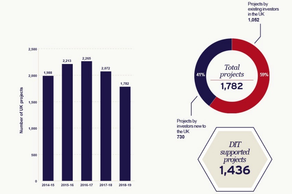 Number of UK projects: 2014-15 1,988, 2015-16 2,213, 2016-17 2,265, 2017-18 2,072, 2018-19 1,782. Total Projects 1,782, 41% or 730 projects by investors new to the UK, 59% or 1.052 projects by existing investors in the UK. DIT supported projects 1,436.