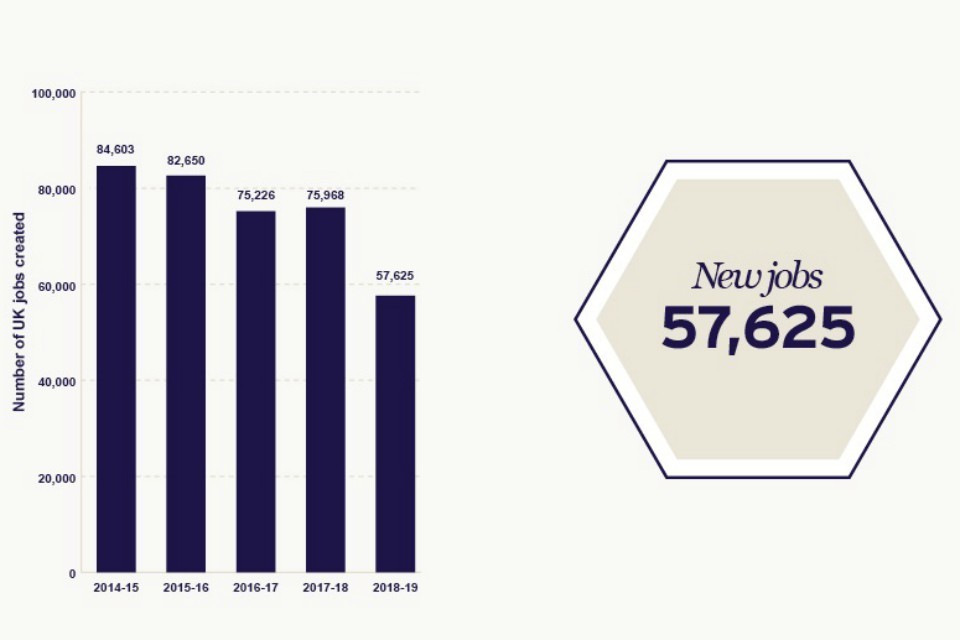 Number of UK jobs created: 2014 to 2015 = 84,603, 2015 to 2016 = 82,650, 2016 to 2017 = 75,226, 2017 to 2018 = 75,968, 2018 to 2019 = 57,625. New jobs 57,625.
