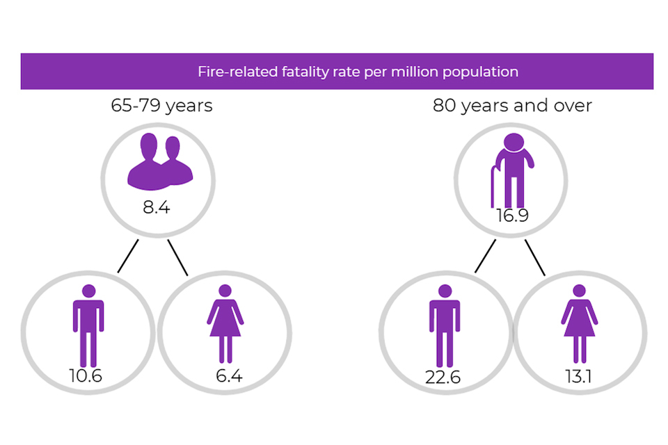 The fire-related fatality rate per million is higher for men and older people. For men aged 65 to 79 the fatality rate was 10.6 per million population while the equivalent rate for women was 6.4 per million. For those aged 80 and over, the rate for men was 22.6 per million and for women was 13.1 per million.