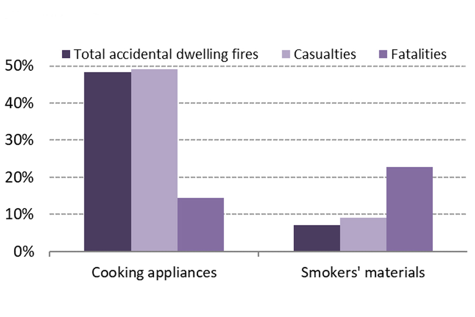 Whilst cooking appliances were by far the biggest ignition category for accidental dwelling fires in 2019/20 (48% of fires) those fires were responsible for 14 per cent of fatalities. Smoking materials showed the reverse with only seven per cent of fires resulting in 23 per cent of fatalities in accidental dwelling fires.