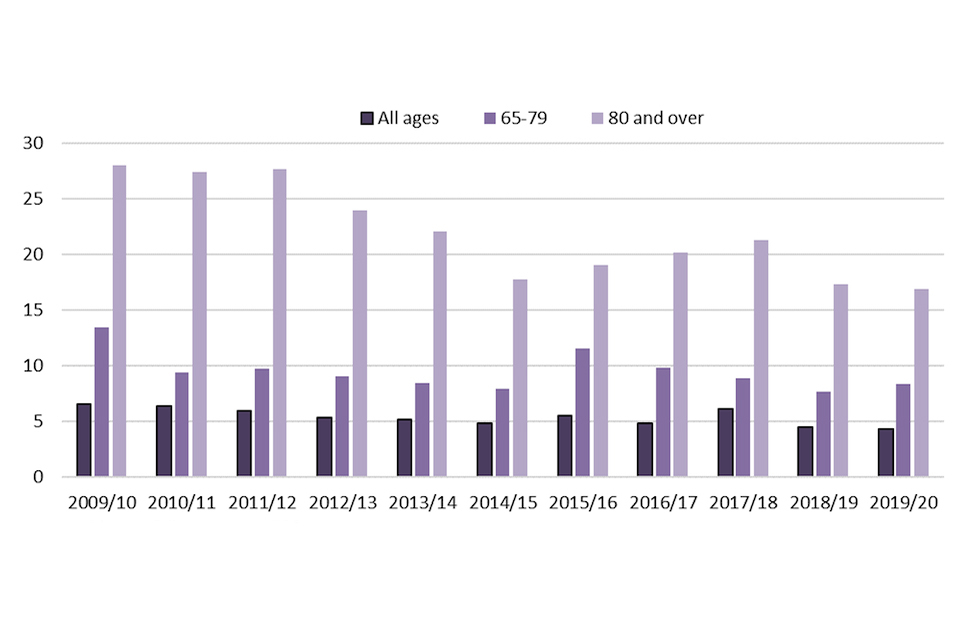 This chart shows that since year ending March 2010 those aged 65-79 and 80 and over have always had a greater fatality rate than “all ages”. The figures for those aged 80 and over have decreased from around 28 to around 16 fatalities per million people over this time.