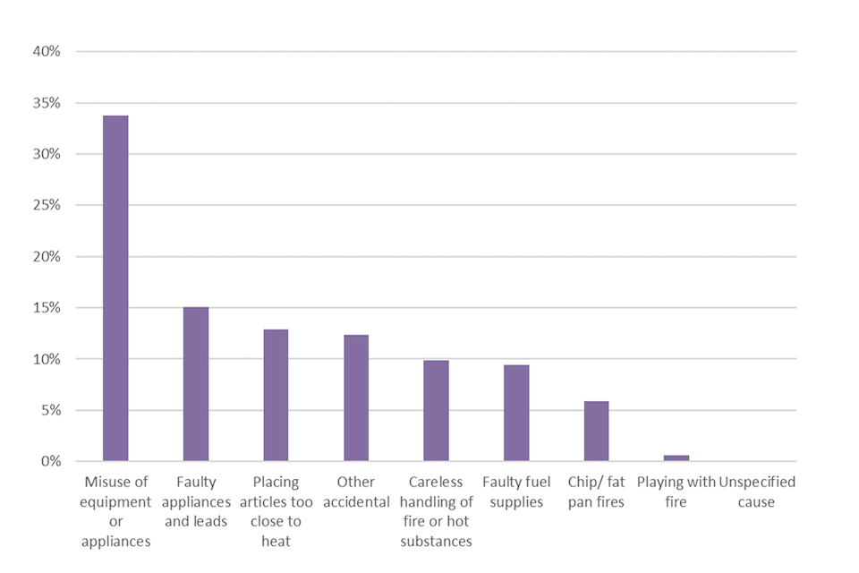This chart shows the cause of fire in accidental dwelling fires. Misuse of equipment or appliance was clearly the largest cause (34%) with faulty appliances and leads (15%), placing articles too close to heat (13%) and “other accidental” (12%). “Careless handling of fire or hot substance”, “Faulty fuel supplies”, “Chip/fat pan fires”, “Playing with fire” and “unspecified cause” all were below 10%.