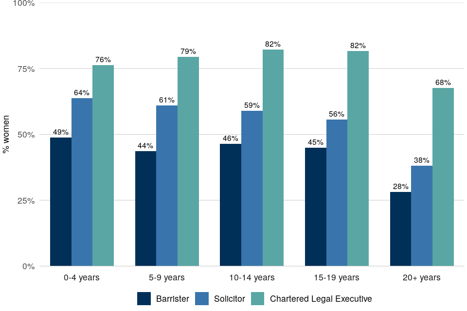 | Women are well represented in the solicitor and Chartered Legal Executive professions, but are less so among the more experienced and more senior members of the legal professions | Women constitute 39% of barristers, 52% of solicitors and 76% of Chartered Legal Executives. Among professionals with 15 or more years of legal experience, 33% of barristers, 44% of solicitors and 73% of Chartered Legal Executives were women. |