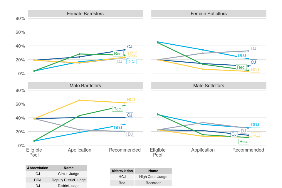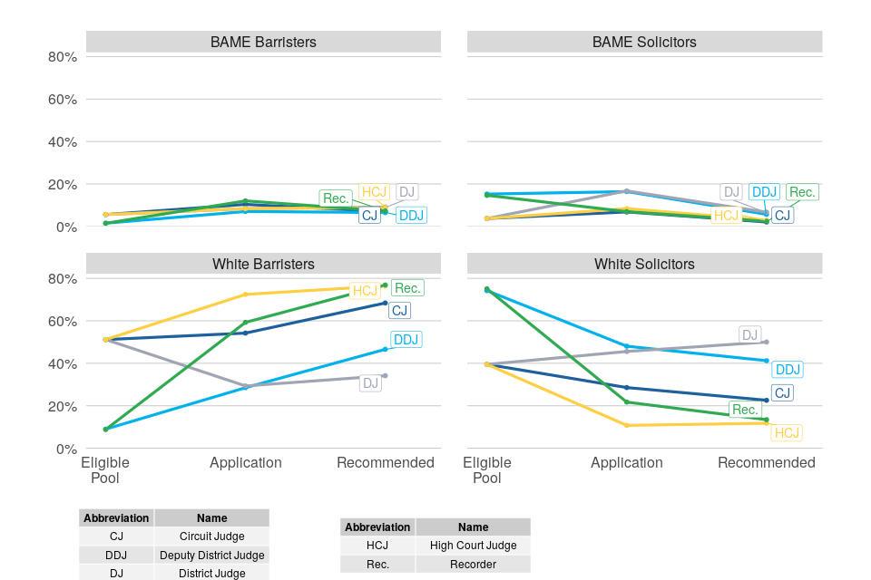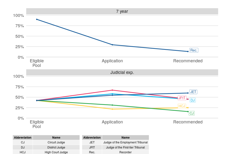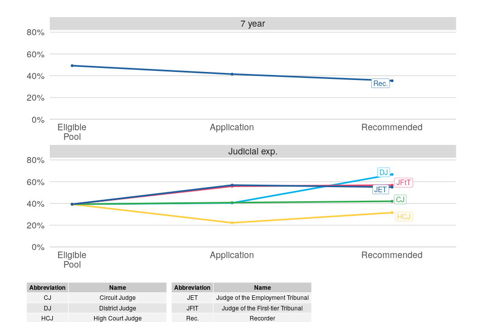 In contrast to gender and ethnicity, comparisons in this section are based on applications, rather than the eligible pool. For posts not requiring judicial experience, 90% of the theoretical eligible pool based on current legal role is solicitors, far in excess of the proportion recommended, so that the relative rates for solicitors are small and provide less insight. These figures are however presented in the data tables. ↩