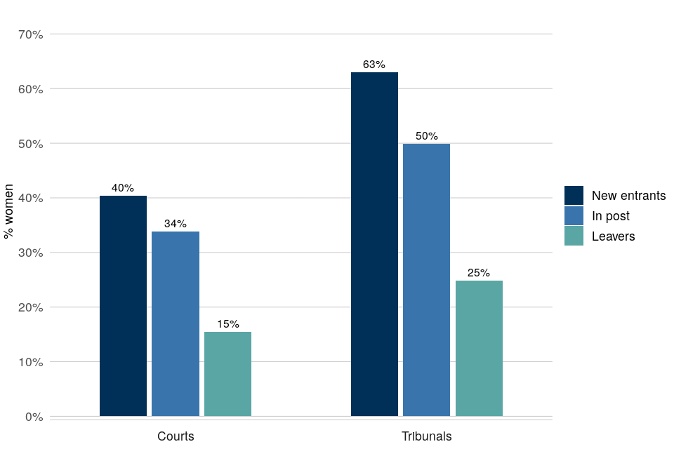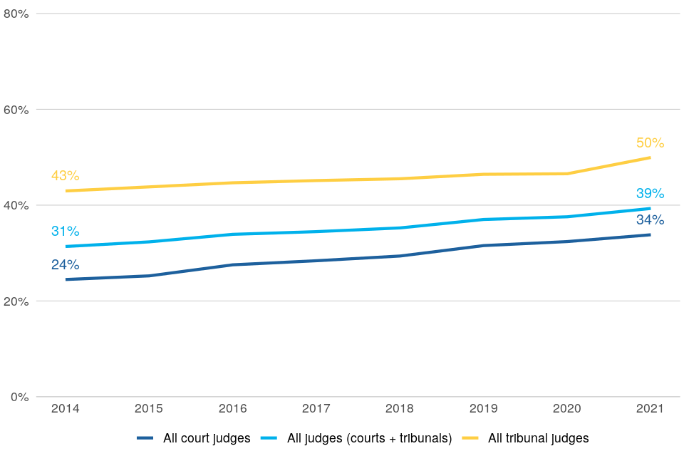 | Women remain under-represented in the courts judiciary, particularly in senior roles | As at 1 April 2021, about a third (34%) of court judges and half of tribunal judges were women. The proportion of women has increased in recent years, but remains lower in senior court appointments (29% for High Court and above). |