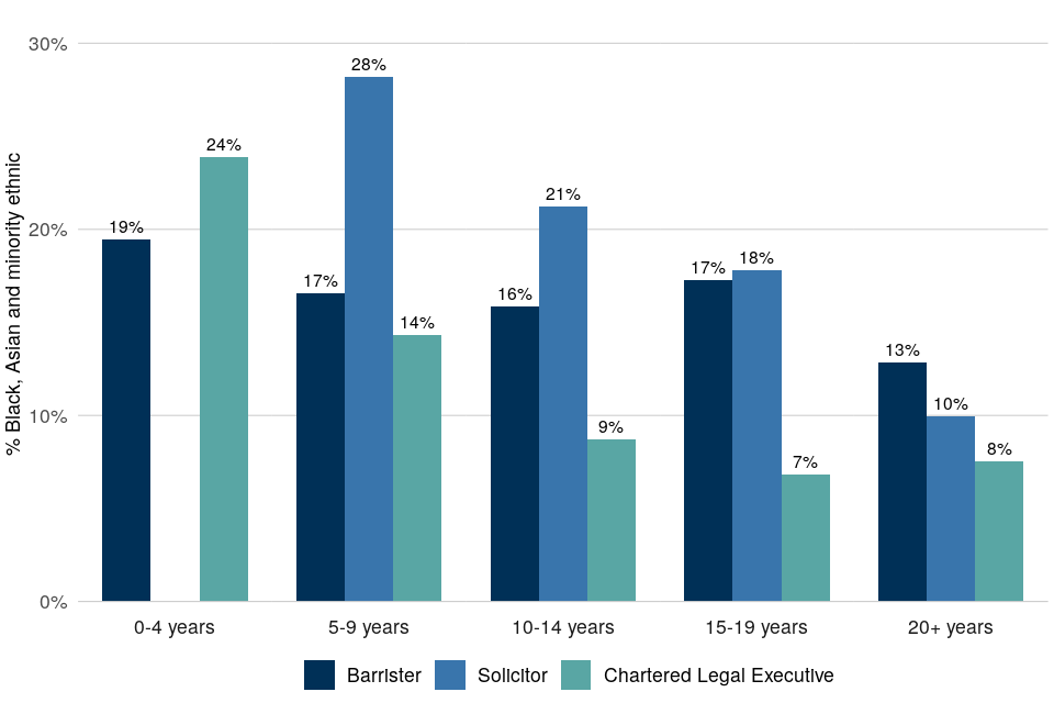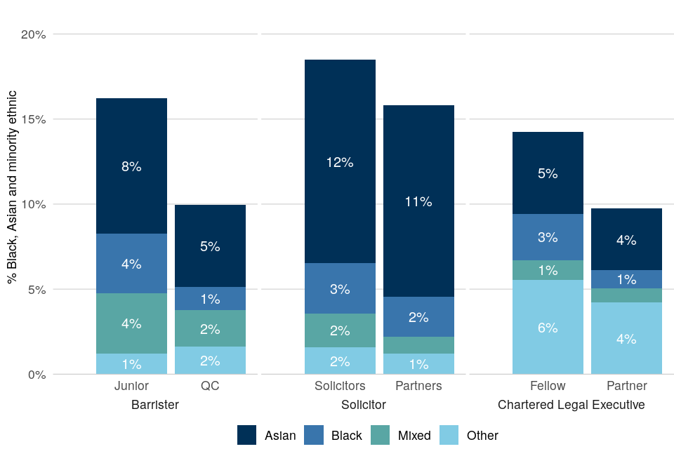 The ethnicity declaration rate for solicitors in PQE band 0-4 is below the required level and the representation percentage has been excluded from this publication. ↩ ↩2 ↩3