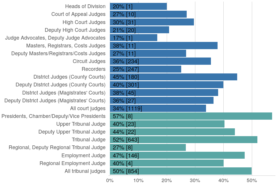 Including deputy and vice presidents. This percentage only includes primary appointments and therefore does not consider Upper Tier Tribunal Presidents and the Employment Appeal Tribunal President as these are not primary appointments. ↩ ↩2