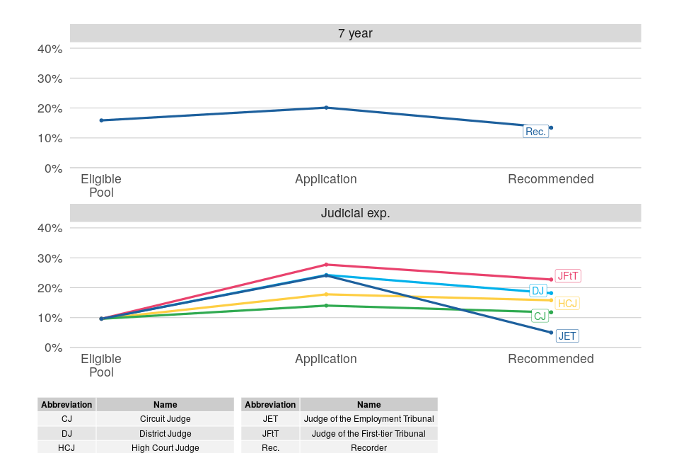 The JAC runs selection exercises for all judicial roles up to and including High Court Judge and Upper Tribunal Judge and convenes panels to make appointments for senior roles; numbers for senior roles are too small to analyse in detail. ↩