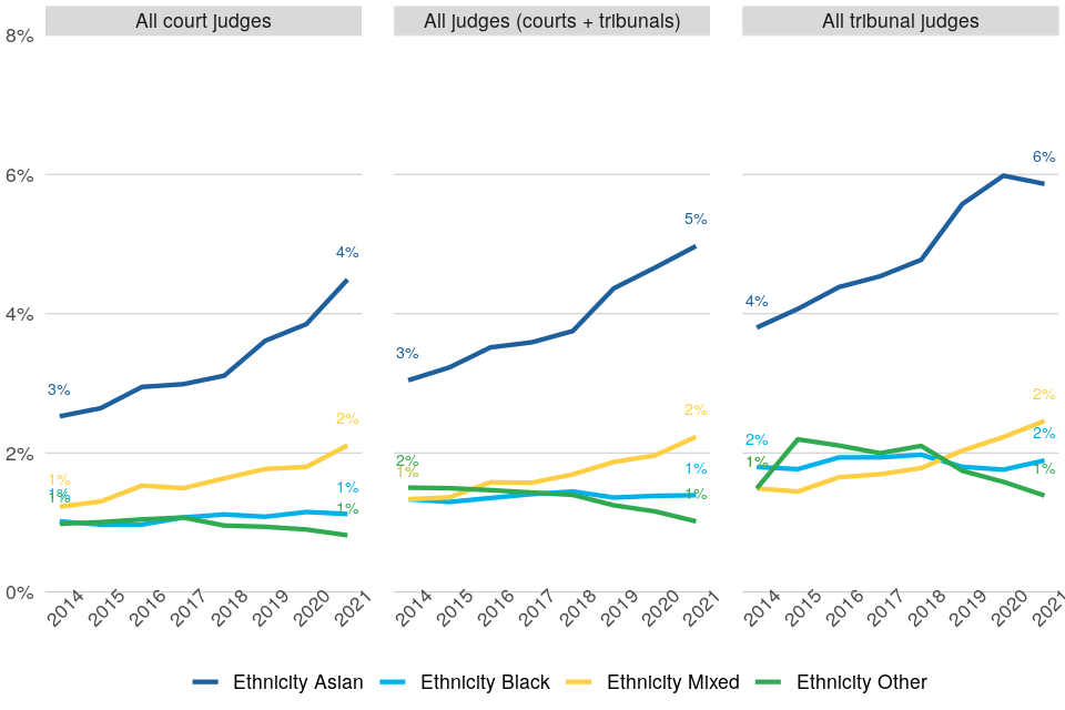 | The proportion of Asian and Mixed ethnicity individuals in the judiciary has increased since 2014, while the proportion of Black individuals has stayed the same in that time. Proportions of ethnic minorities remain lower in senior court roles | As at 1 April 2021, 5% of judges were from Asian backgrounds, 1% were from Black backgrounds, 2% were from Mixed ethnic backgrounds and 1% were from Other ethnic minority backgrounds. The proportion of ethnic minorities is lower for senior court appointments (4% for High Court and above) compared to others. |