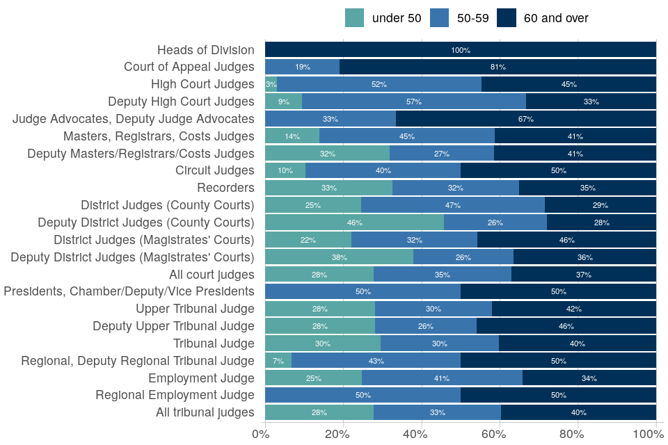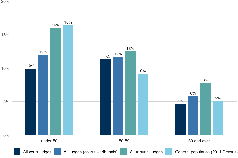 | Most judges are aged 50 or over | 72% of court judges and 72% of tribunal judges were aged 50 and over, with 37% aged 60 and over in courts and 40% in tribunals. Across all legal selection exercises, those aged 50 and over accounted for 41% of applications and 39% of recommendations. |
