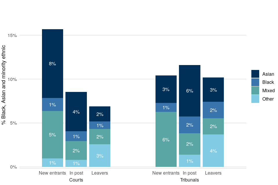 In total, Black, Asian and minority ethnic individuals constituted 17% of all non-legal members of tribunals (2 percentage points higher than in 2014) and 13% of all magistrates (a 5 percentage point increase from 2014 when 8% declared themselves as Black, Asian and minority ethnic).