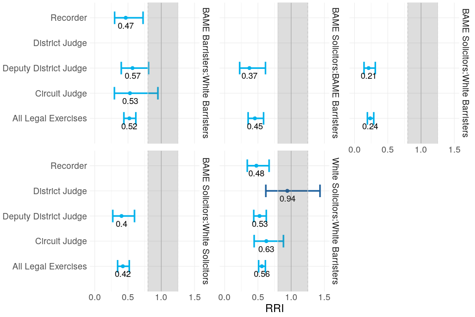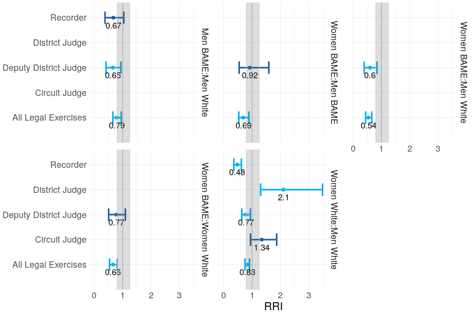 In the Gender-Profession, Ethnicity-Profession and Gender-Ethnicity-Profession sections, RRIs comparing groups’ recommendation rates from application are presented, as opposed to recommendation rates from the eligible pool, because of how dominant solicitors are in the overall eligible pool (they constitute 88% of it in this case). With so many more solicitors in the eligible pool, solicitors’ progression rate from eligible pool through to recommendation is very low by default and therefore, comparing it to the same rate for barristers is less informative than looking at the application to recommendation rates. ↩ ↩2 ↩3
