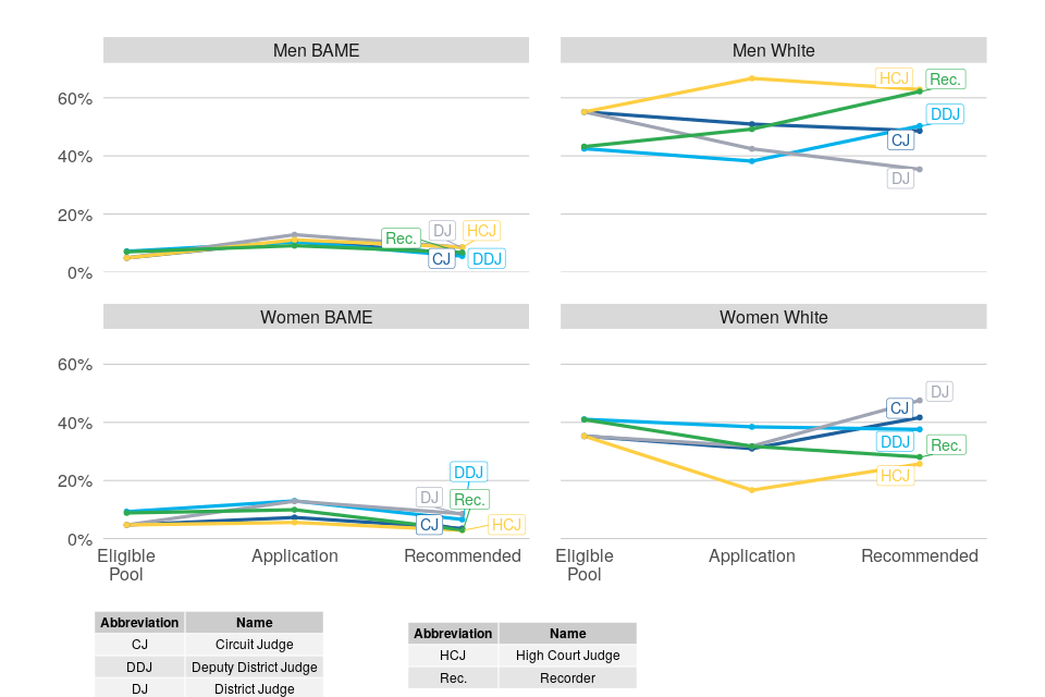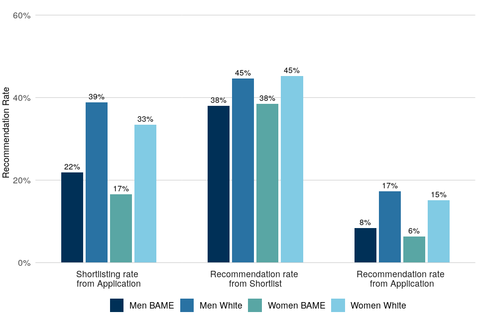 | Representation of both Black, Asian and minority ethnic men and women is higher among applications than recommendations. Both groups have lower recommendation rates than White candidates | Across all legal exercises between April 2018 and April 2021, Black, Asian and minority ethnic men accounted for 11% of applications and 6% of recommendations. Black, Asian and minority ethnic women accounted for 13% of applications and 6% of recommendations. White women accounted for 36% of applications and 39% of recommendations. White men accounted for the remaining 40% of applications and 49% of recommendations. |