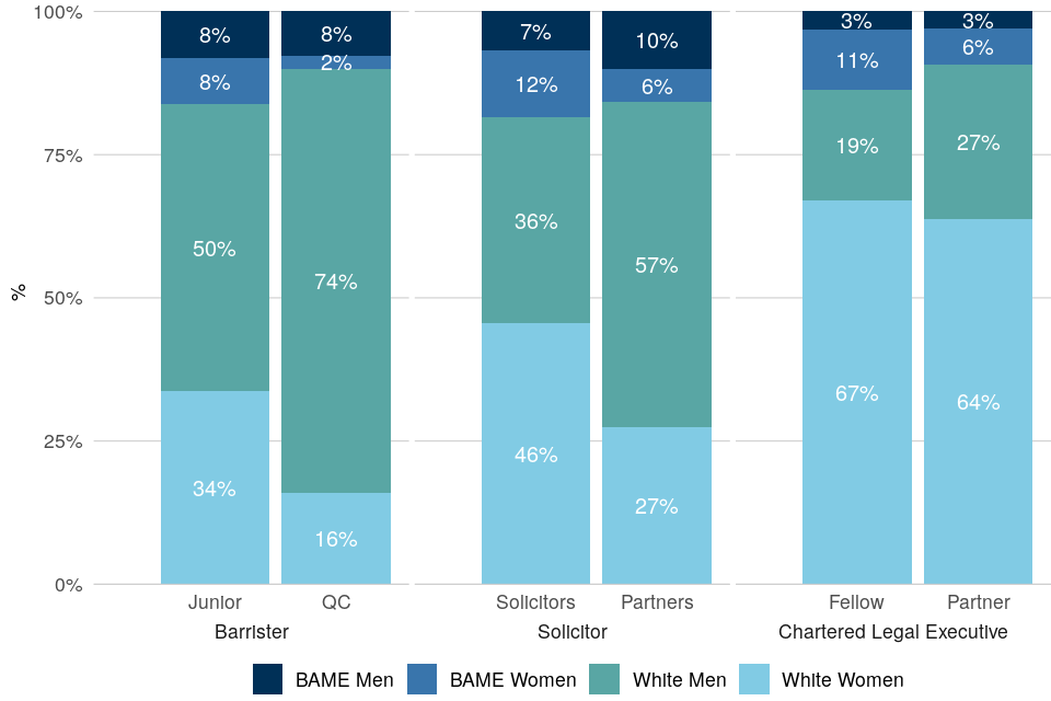 | Representation of gender-ethnicity intersection groups varies across the legal professions. In all three professions, representation of White men was higher in professionals with more experience and in higher seniority positions | As at 1 April 2021, White men constituted the highest proportion of barristers (53%), followed by White women (32%), Black, Asian and minority ethnic men (8%) and Black, Asian and minority ethnic women (7%). White men and White women constituted the joint highest proportion of solicitors (41%), followed by Black, Asian and minority ethnic women (10%), then men (8%). White women constituted two thirds (67%) of Chartered Legal Executives. |