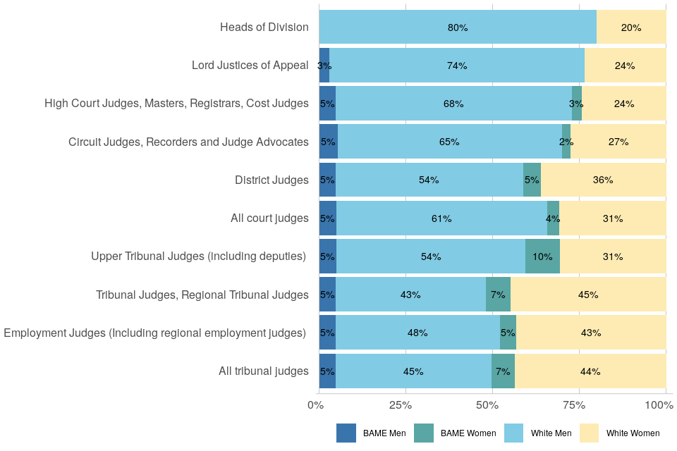 | More than half of the judiciary are White men and a third are White women. Black, Asian and minority ethnic men and women each account for 5% of judges | As at 1 April 2021, Black, Asian and minority ethnic men and women each accounted for 5% of judges in post. White women accounted for 35% and White men accounted for the remaining 55%. Representation of these groups differed between courts and tribunals, with a higher proportion of women from both White and Black, Asian and minority ethnic backgrounds among tribunal judges. Within the senior courts, White men constituted a larger proportion of posts. |