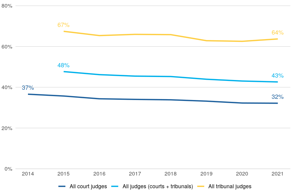 As at 1 April 2021, women represented 53% of all non-legal members of tribunals (8 percentage points higher than in 2014) and 56% of all magistrates (4 percentage points higher than in 2014).
