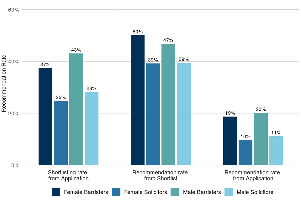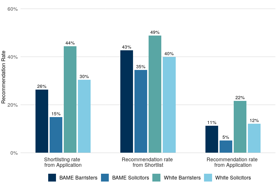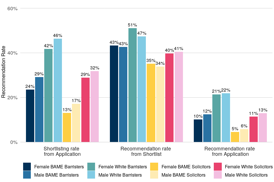 | Black, Asian and minority ethnic barristers have lower recommendation rates than White barristers. Black, Asian and minority ethnic solicitors have lower recommendation rates than all three other ethnicity-profession groups | Across all legal exercises between April 2018 and April 2021, Black, Asian and minority ethnic barristers accounted for 9% of applications and 7% of recommendations. Black, Asian and minority ethnic solicitors accounted for 15% of applications and 5% of recommendations. White solicitors accounted for 42% of applications and 36% of recommendations. White barristers accounted for 35% of applications and 52% of recommendations. |