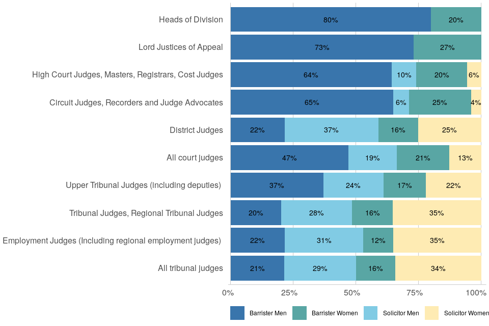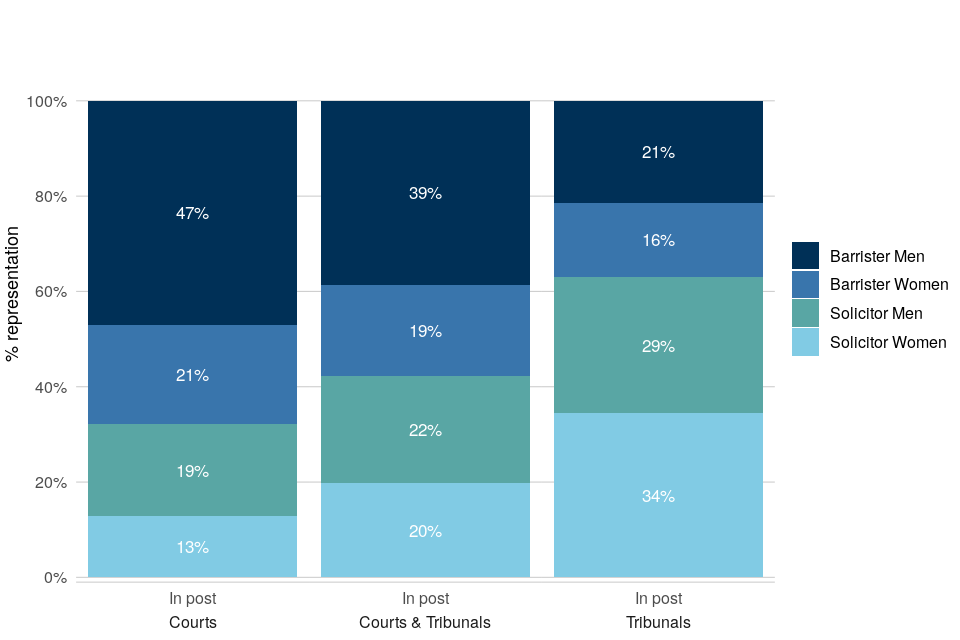 | Male barristers are the largest gender-profession group in the judiciary and are more represented in senior posts | At 1 April 2021: 39% of judges were male barristers, 19% were female barristers, 22% were male solicitors and 20% were female solicitors. Representation of these groups differed between courts and tribunals, with a higher proportion of male and female solicitors among tribunal judges. Within the senior courts judiciary, male barristers occupied the majority of posts. |