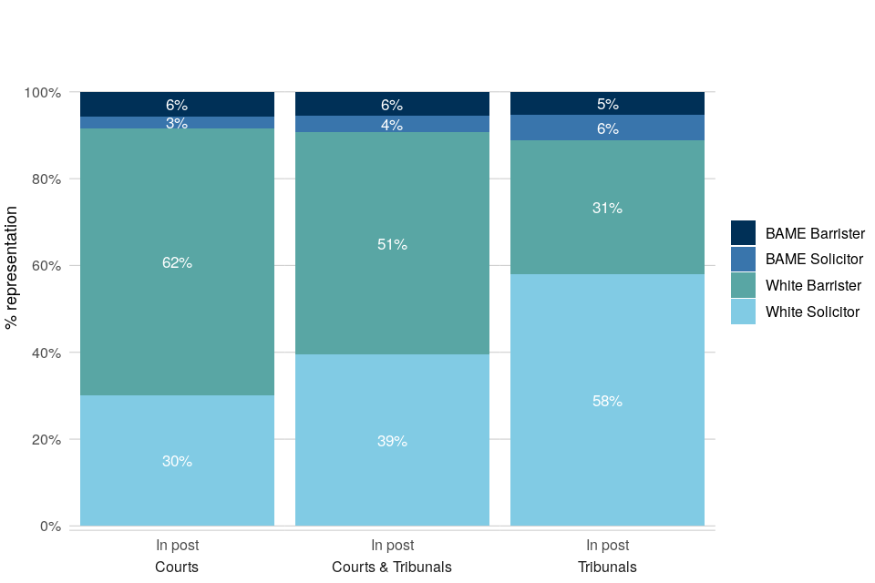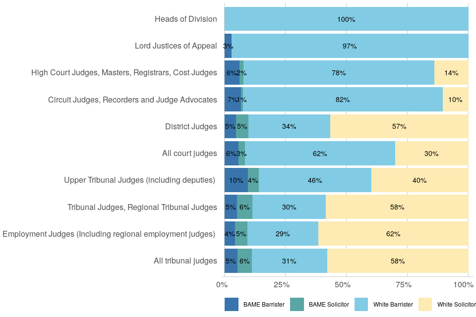 | White barristers are the largest ethnicity-profession group in the judiciary and are more represented in senior posts | At 1 April 2021: 6% of judges were Black, Asian and minority ethnic barristers, 4% were Black, Asian and minority ethnic solicitors, 39% were White solicitors and 51% were White barristers. Representation of these groups differed between courts and tribunals, with a higher proportion of Black, Asian and minority ethnic solicitors among tribunal judges. Within the senior courts judiciary, White former barristers occupied almost all posts. |