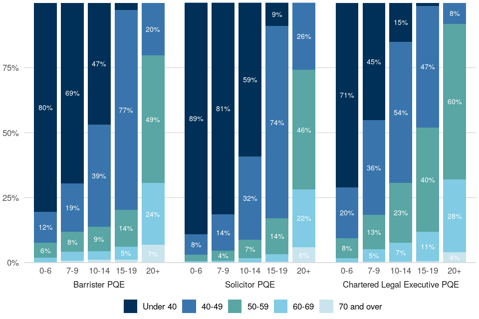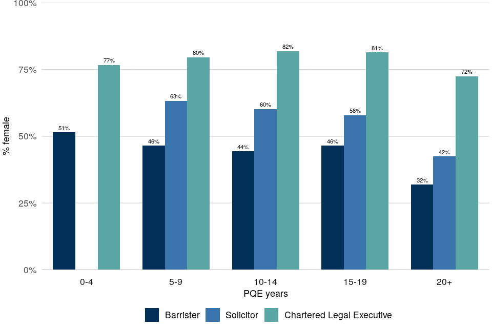 Figure 1: Proportion of female legal professionals by PQE band, April 2024[footnote 9] Across all legal professions, the proportion of female professionals is notably lower for those having 20+ years’ experience.