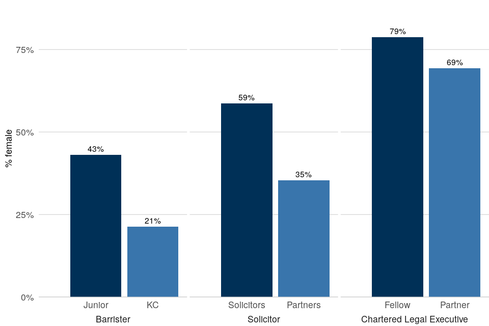 | The female population is generally well represented in the legal professions. | 40% of barristers, 53% of solicitors, 77% of Chartered Legal Executives, and 43% of all judges were female. |