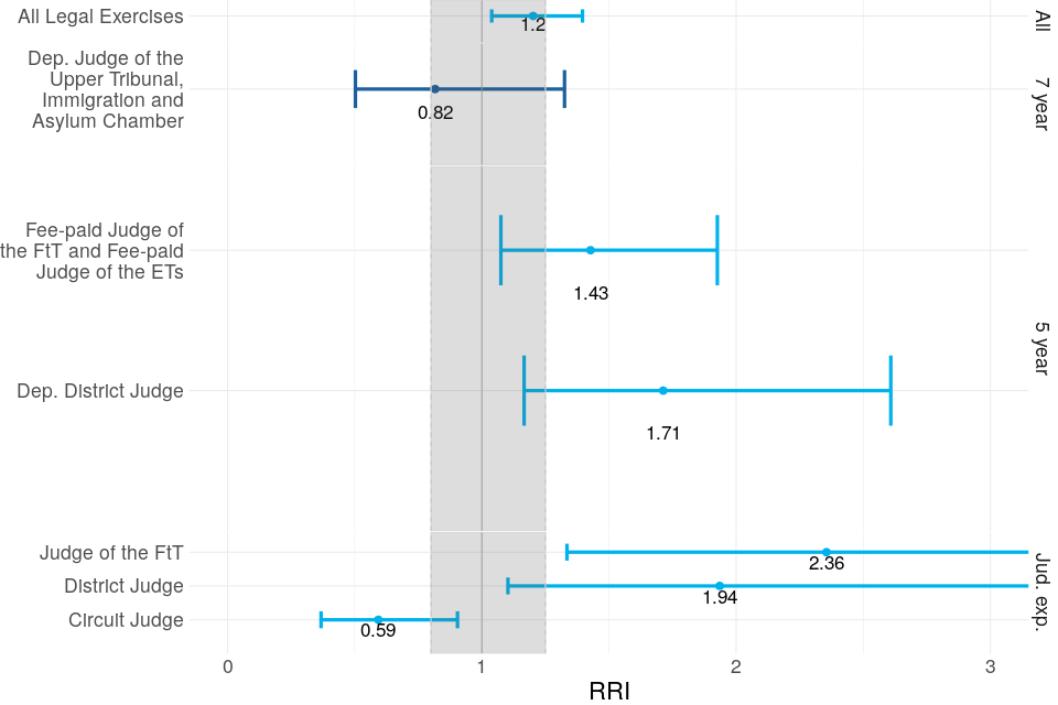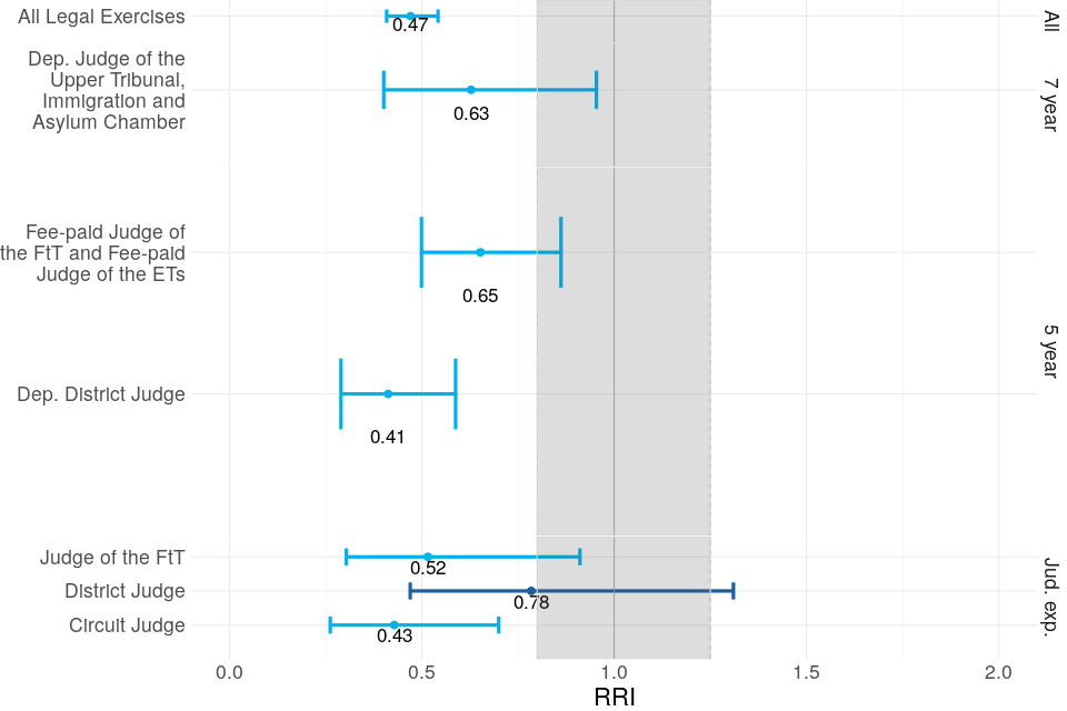 In four exercises - District Judge, Deputy District Judge, Judge of the First-tier Tribunal, and Fee-paid Judge of the First-tier Tribunal and Fee-paid Judge of the Employment Tribunals - the respective RRIs from eligible pool to recommendation indicate that the odds of success for female candidates were higher than for their male counterparts[footnote 15]. For the Circuit Judge exercise, the equivalent RRI (0.59) indicates that the odds of success was higher for male candidates.
