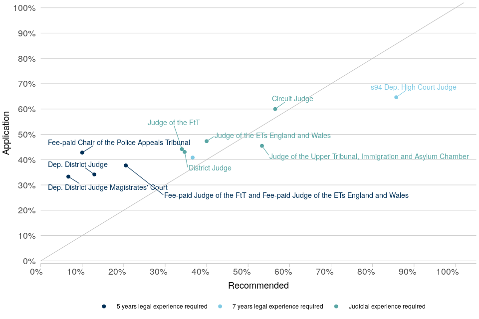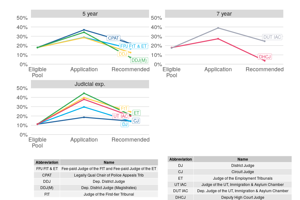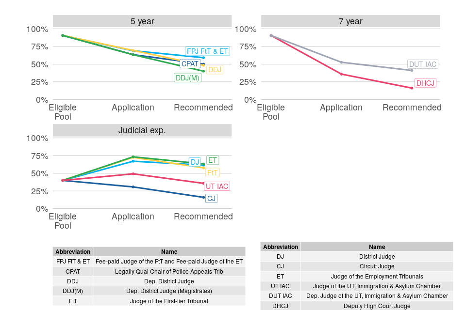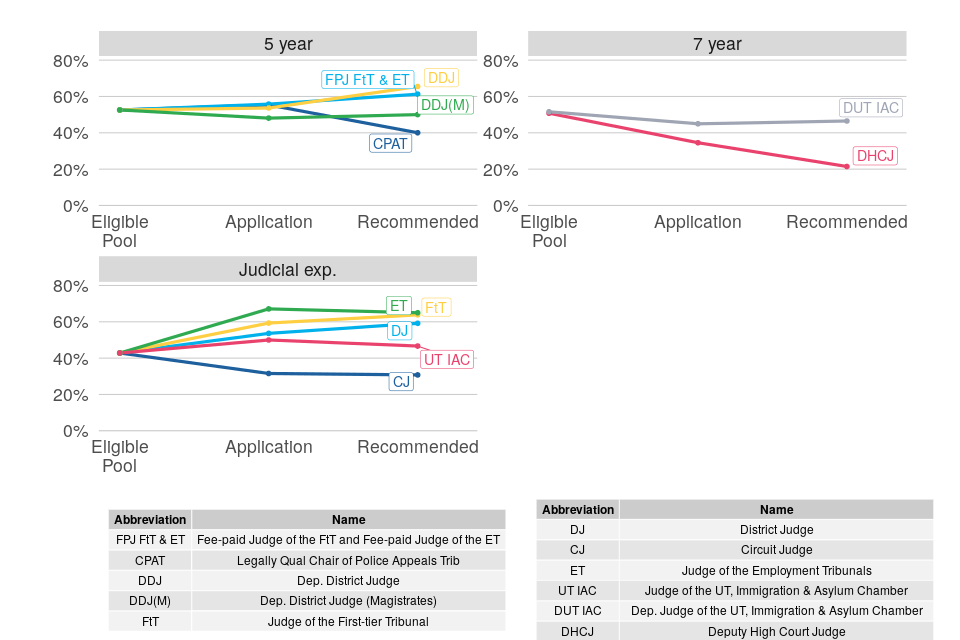 In contrast to sex and ethnicity, comparisons in this section are based on applications, rather than the eligible pool. For posts not requiring judicial experience, 90% of the eligible pool based on current legal role are solicitors, far more than the proportion that had been recommended, so that the relative rates for solicitors are small and provide less insight. These figures are however presented in the data tables. ↩