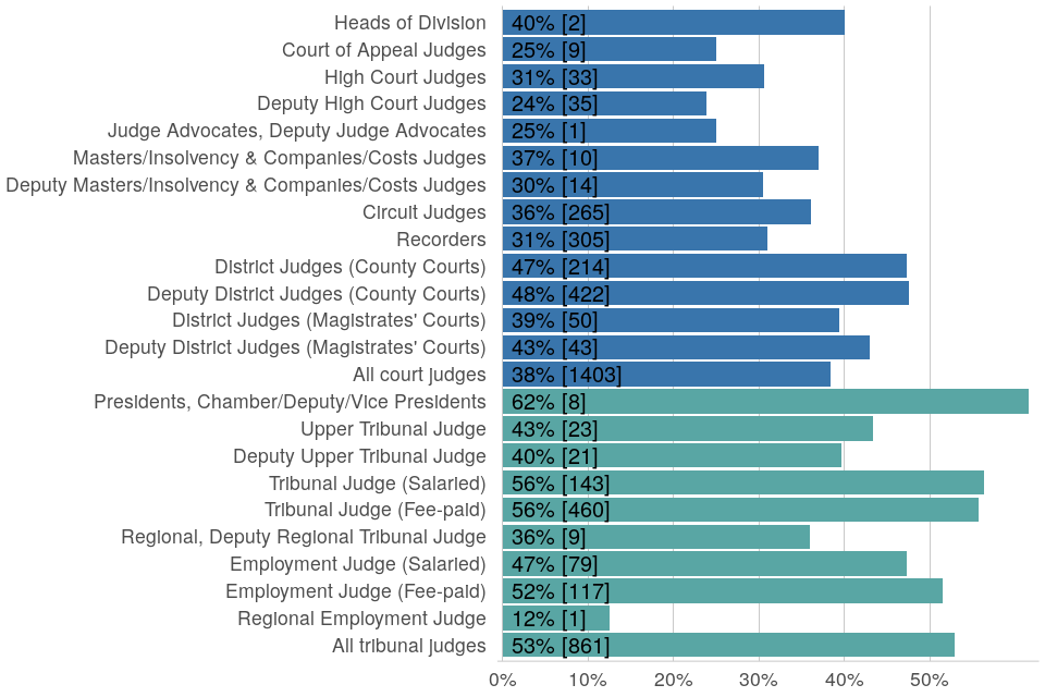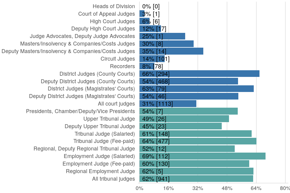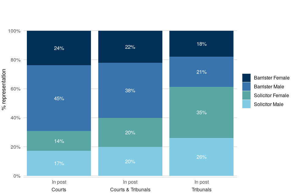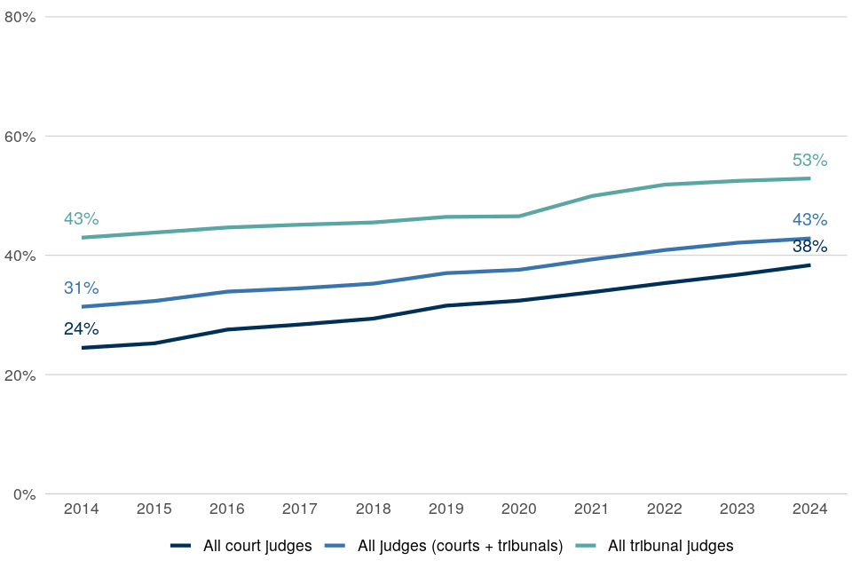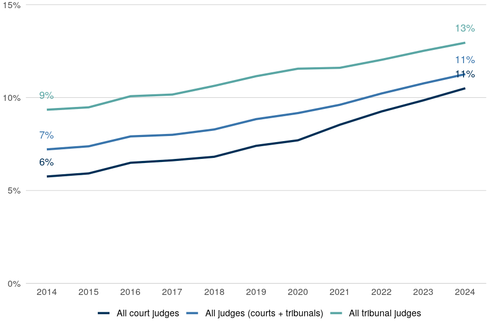 Female representation among judges in post has increased over recent years, for both courts and tribunals judges.