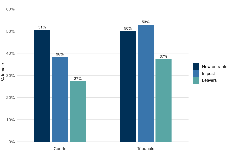 Leavers: The proportion of female judges in post who had left the judiciary during 2023/24 (3%) was slightly less than that for male judges (5%).