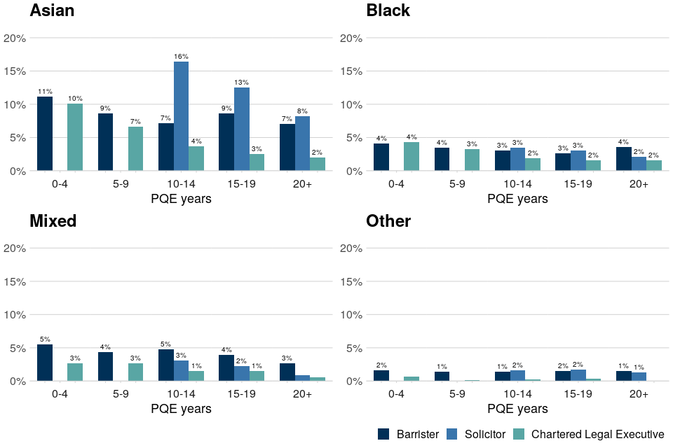 The ethnicity declaration rates for solicitors in PQE bands 0-4 and 5-9 (5-6 and 7-9 combined) are below the required level for analysis, and so the representation percentages have been excluded from this publication. ↩