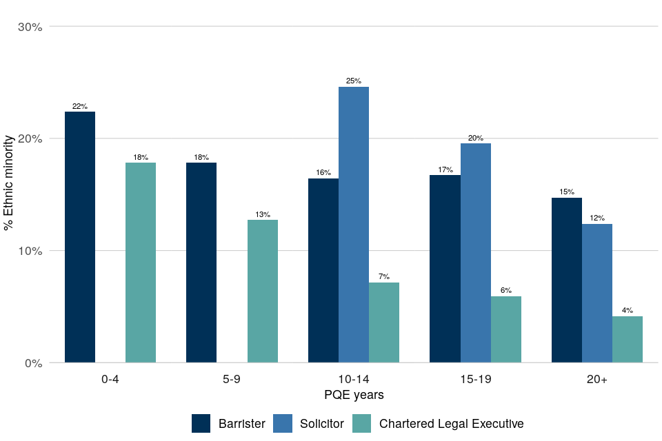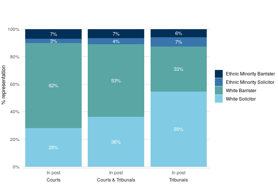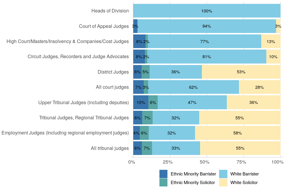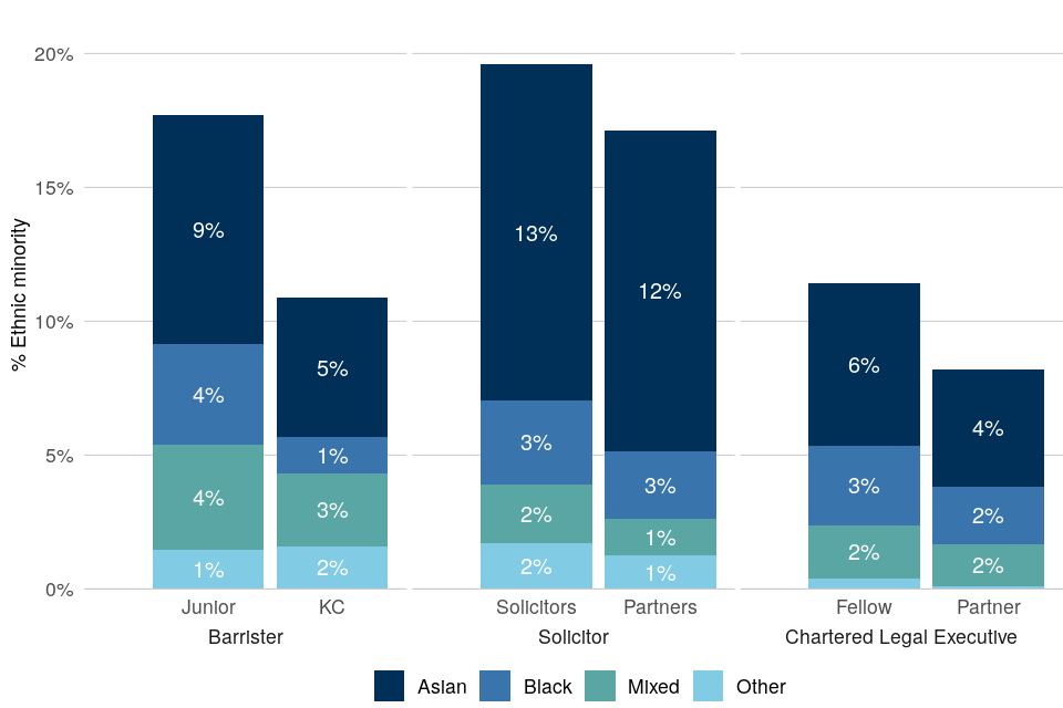 | There has been a gradual increase in the representation of ethnic minorities in the legal professions and judiciary. | Since 2014, the ethnic minority proportion of barristers increased from 13% to 17%, of solicitors from 15% to 19%, of Chartered Legal Executives from 5% to 11%, and from 7% to 11% for all judges. |