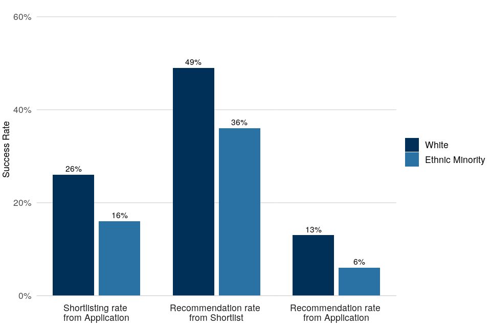 | There is no evidence of disparity for ethnic minority candidates overall compared to white candidates in legal judicial selection exercises from eligible pool to recommendation. At a more granular level of ethnicity, this also applies to Asian and black candidates. | Across all legal exercises in 2023-24, ethnic minority candidates accounted for 15% of the eligible pool and 16% of recommendations. For Asian candidates the proportions were both 9%, and for black candidates the proportions were both 2%. |