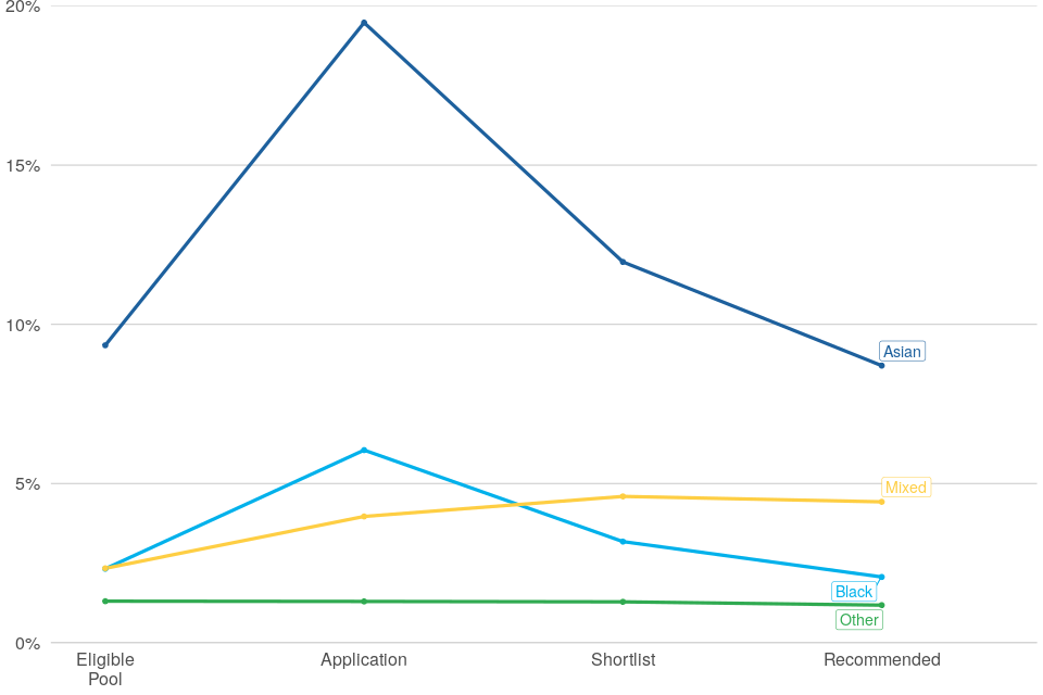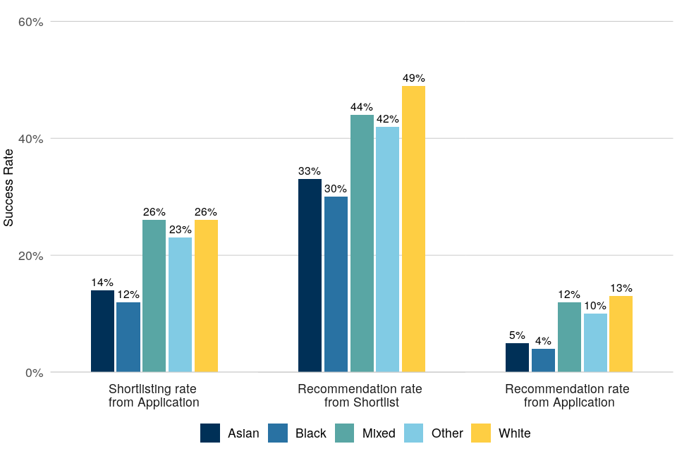 Over a three-year period there is still no disparity between ethnic minority candidates overall compared to white candidates, and mixed ethnicity candidates are still more likely to be appointed when compared to white candidates. However, black/black British and those of other ethnic minority groups are less likely to be appointed compared to white candidates.
