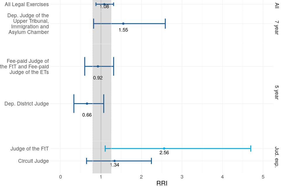In 2023-24, five of the six legal exercises where an RRI could be calculated showed a statistically and practically significant sex disparity (Figure 4).