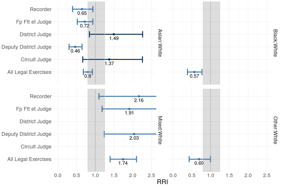 Ethnic minority representation amongst the legal professions is in line with the general population of working age (25-74). Representation within the judiciary is lower compared to the general working age population but is comparable to older ages of this working population (50-74). There is no evidence of disparity in the judicial appointments process from eligible pool to recommendation between the combined group of ethnic minorities and white candidates in legal exercises in the latest year. This also applies to the specific Asian/Asian British or black/black British ethnic minority groups compared to white candidates, but mixed ethnicity candidates are more likely to be appointed when compared to white candidates.