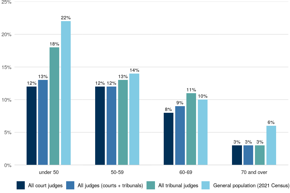 In order to most appropriately assess the figures and trends in judicial diversity, comparisons in this publication are made against the relevant population in England and Wales, from which the legal professions and the majority of judges are derived. Previous reports used the general population aged 25-74 from the 2021 Census. Given the older profile of those applying to become a judge and particularly those already a judge, this report also makes comparison to the 50-74 age-group from the 2021 Census. We also make comparisons to the Annual Population Survey’s (APS) economically active population, in order to recognise that not all members of particular demographic groups within these age ranges are employed or actively looking for work.