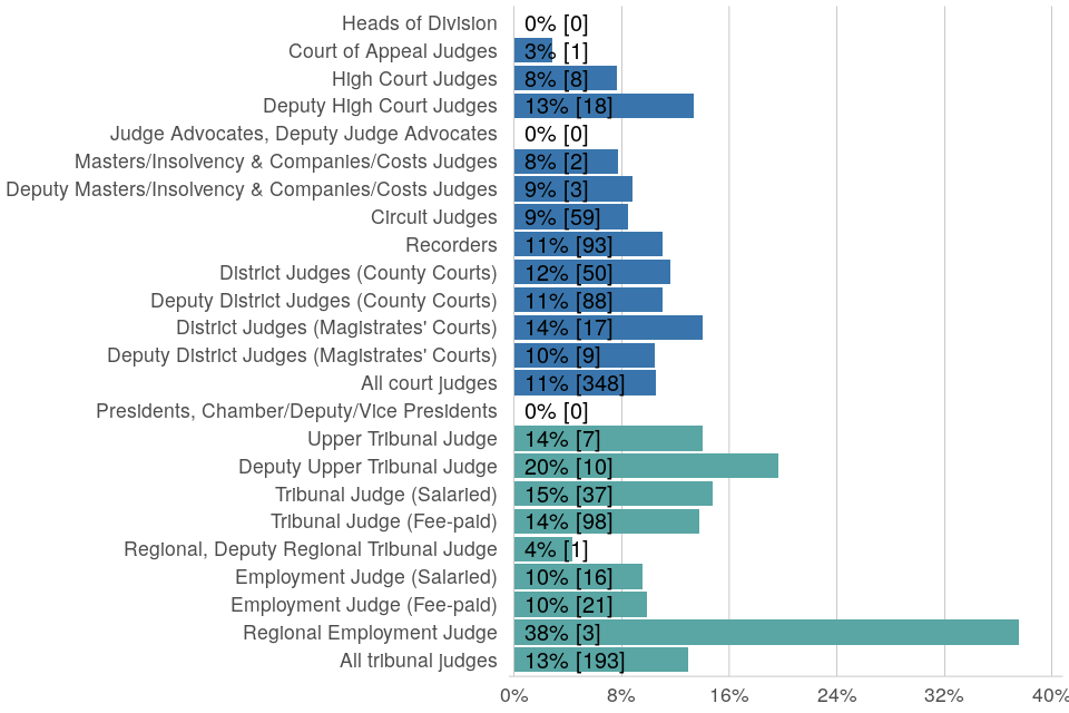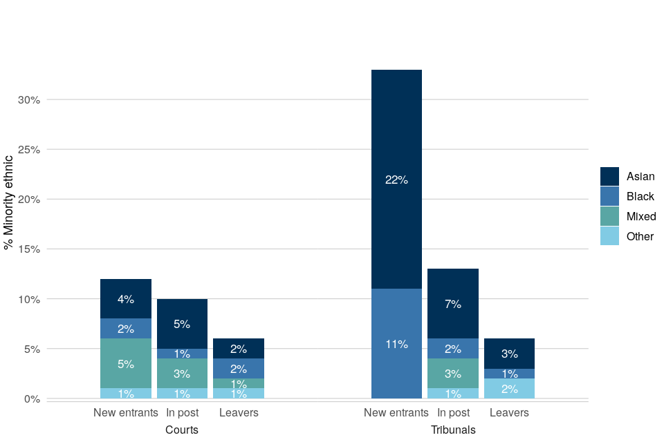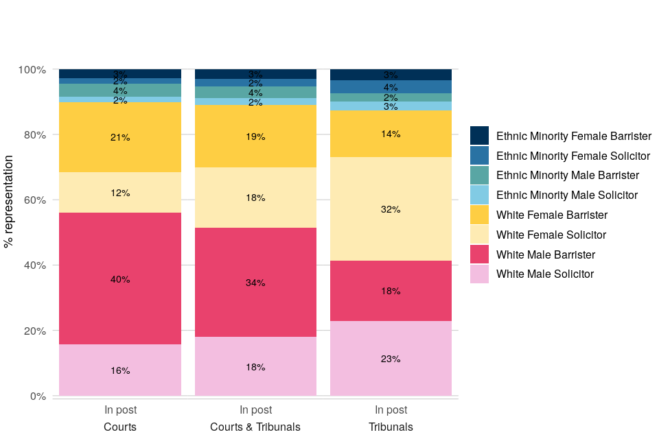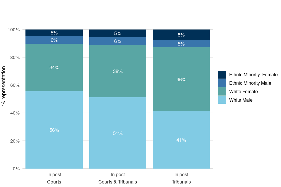 Female representation and ethnic minority representation was higher in those posts which do not require a legal background (magistrates and non-legal tribunal members), compared to judges currently in post. In addition there were over 2,000 appointments to become a magistrate in the year and the proportion of those from an ethnic background was slightly higher than that for the current magistracy.