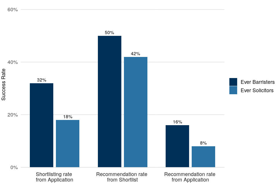 To prevent double counting, if an applicant has declared both a previous role of solicitor and barrister, a value of 0.5 has been assigned for both solicitor and barrister. When referring to “ever” solicitor or “ever” barrister, these adjusted figures are used. ↩