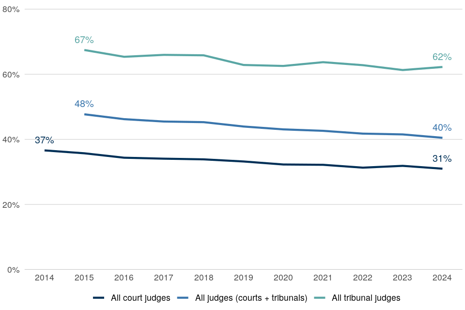 Table 3.4 shows that as at 1 April 2024, female representation among all court judges (38%) was 14 percentage points higher than in 2014[footnote 17], and that for all tribunal judges (at 53%) it was 10 percentage points higher than in 2014 (Figure 6).