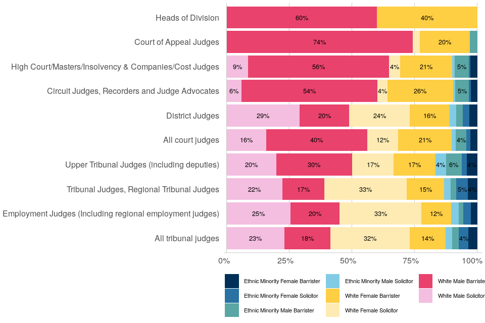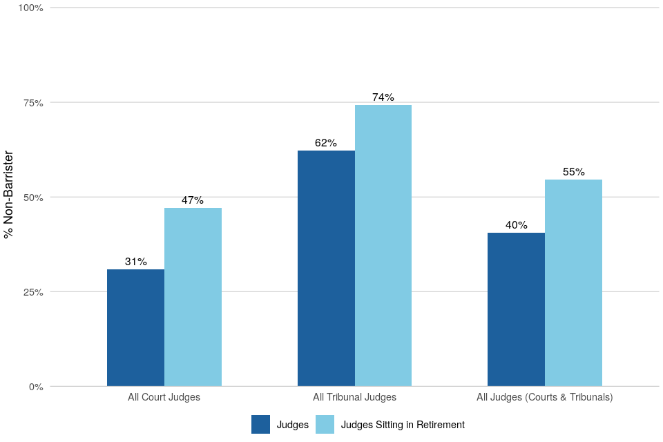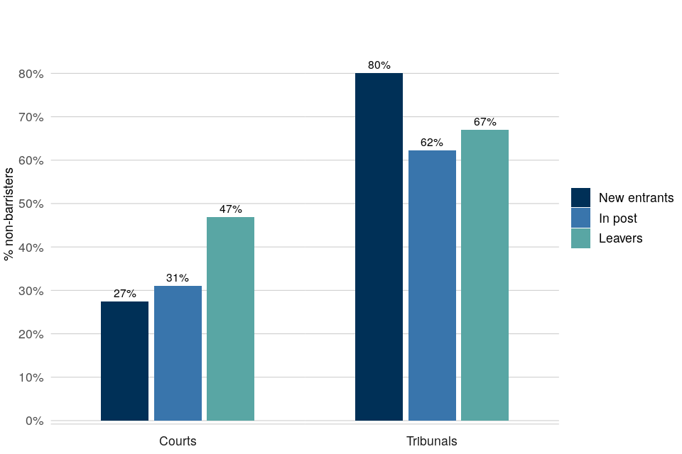 | Tribunal judges are twice as likely to have a non-barrister background than court judges | Overall, 31% of court judges and 62% of tribunal judges were from non-barrister backgrounds (mostly solicitors). |