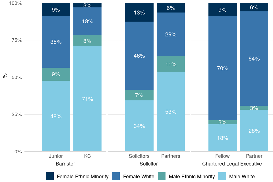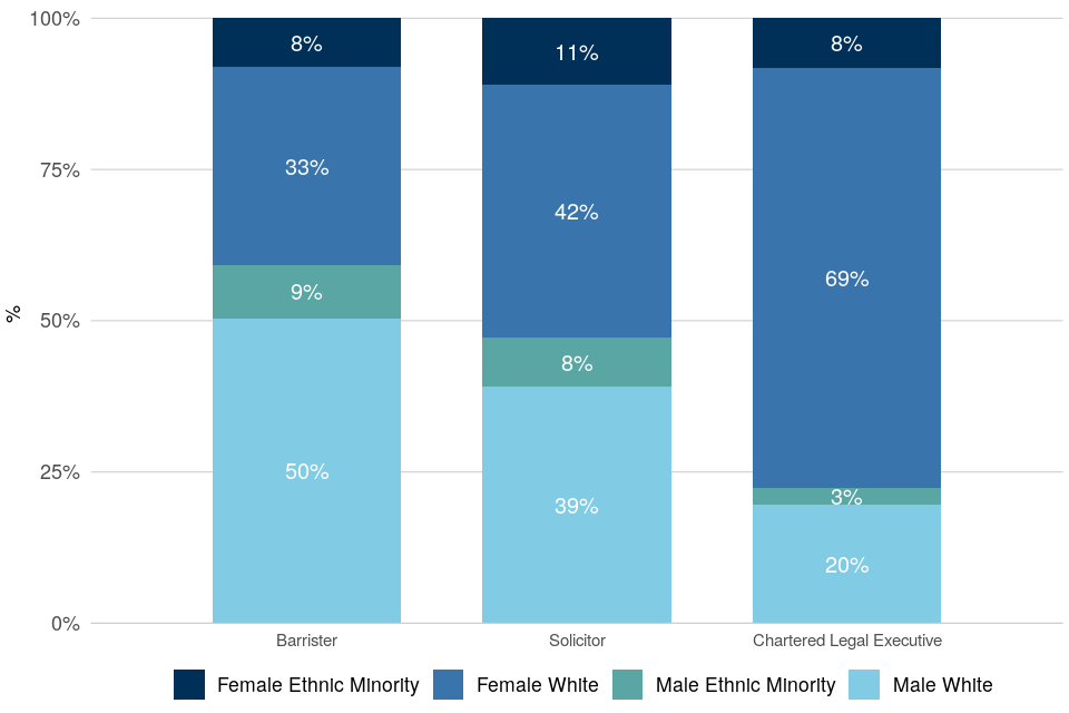 Although the female population is generally well represented in the legal professions as a whole, as at 1 April 2024 the female proportion varied between the legal professions- from 40% of barristers, 53% of solicitors, to 77% of Chartered Legal Executives.