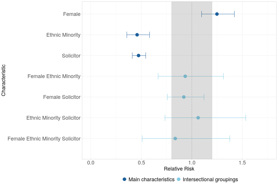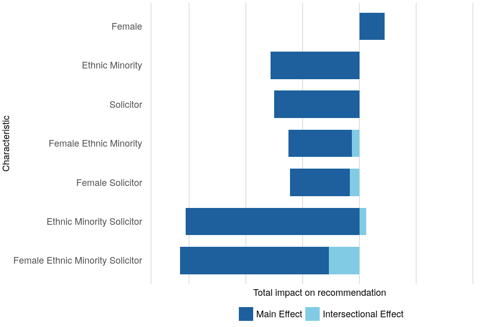 This captures any additional impact of being a female ethnic minority solicitor which was not already captured by the 2-way intersectional groupings above. The combined intersectional impact of being a female ethnic minority solicitor is a 24% decrease in the odds of recommendation, calculated by combining the impacts from the 4 groupings. ↩
